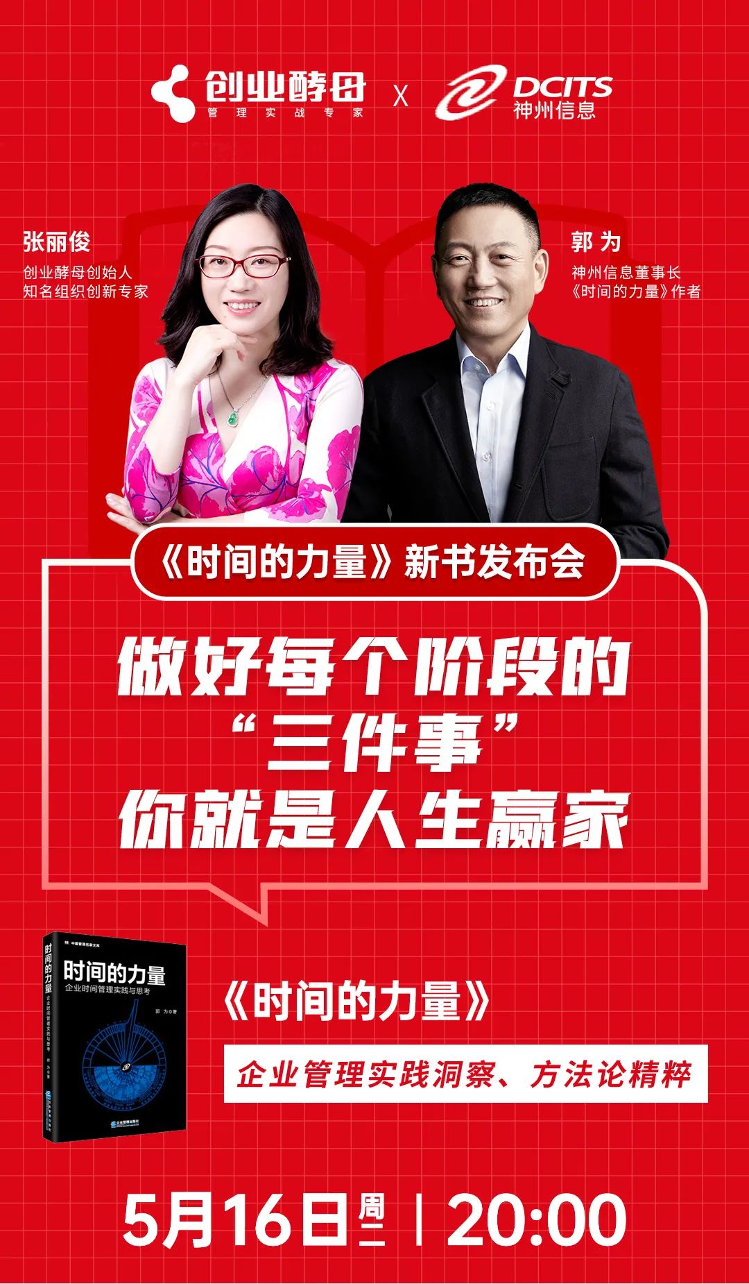 5月16日20:00,郭为将携新书《时间的力量》做客创业酵母创始人、知名组织创新专家张丽俊的直播间,共同探讨时间管理,为读者揭开生产力、效率、利益与时间之间的奥秘。